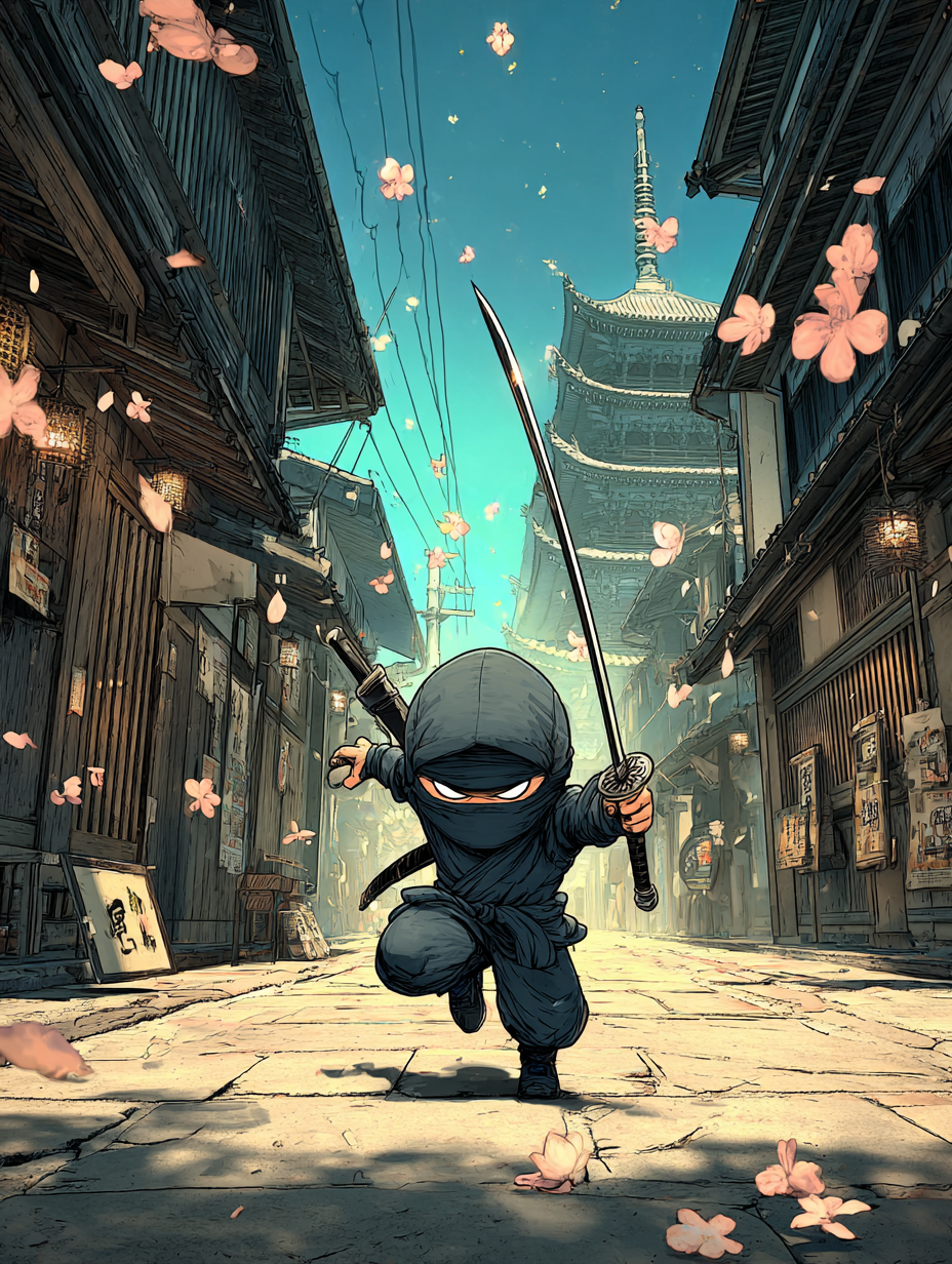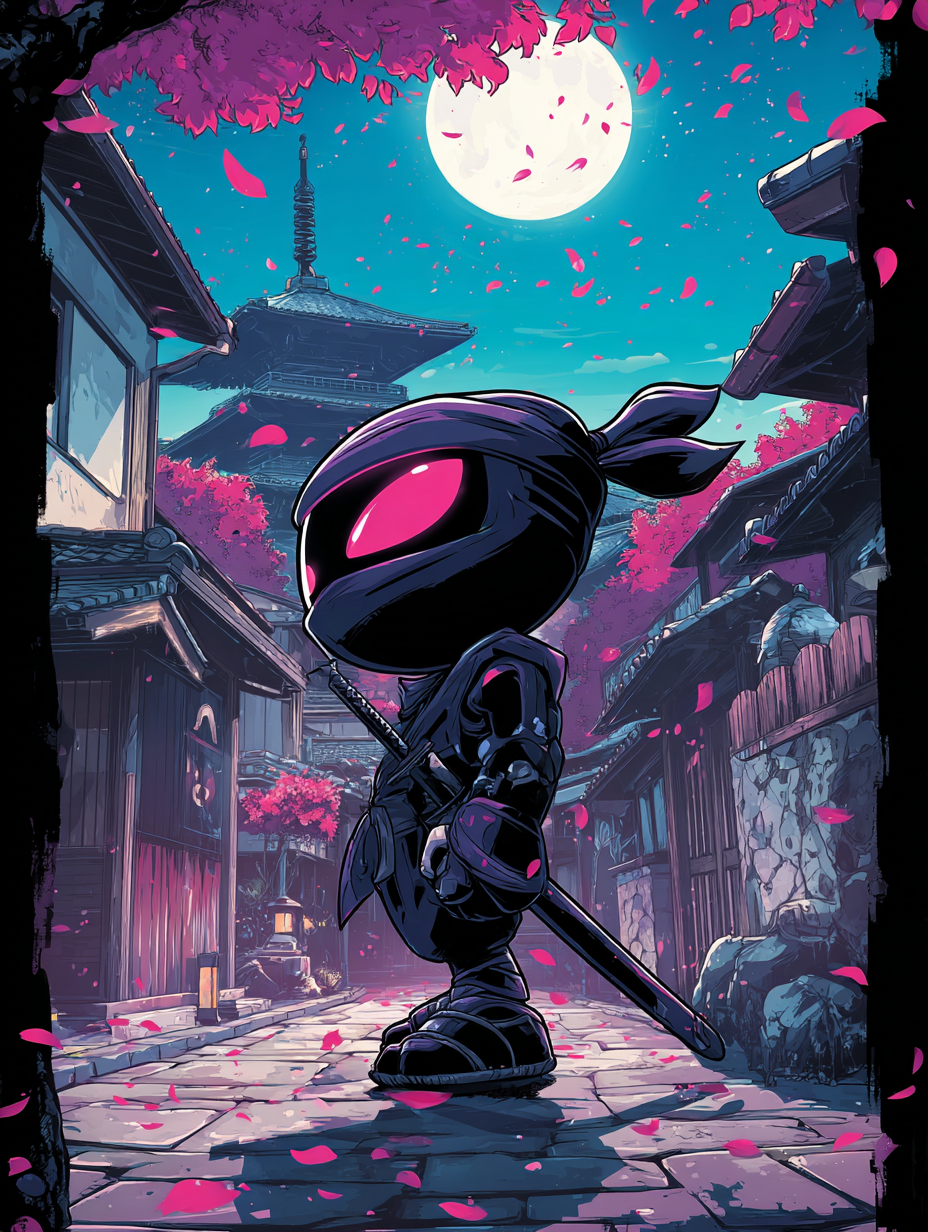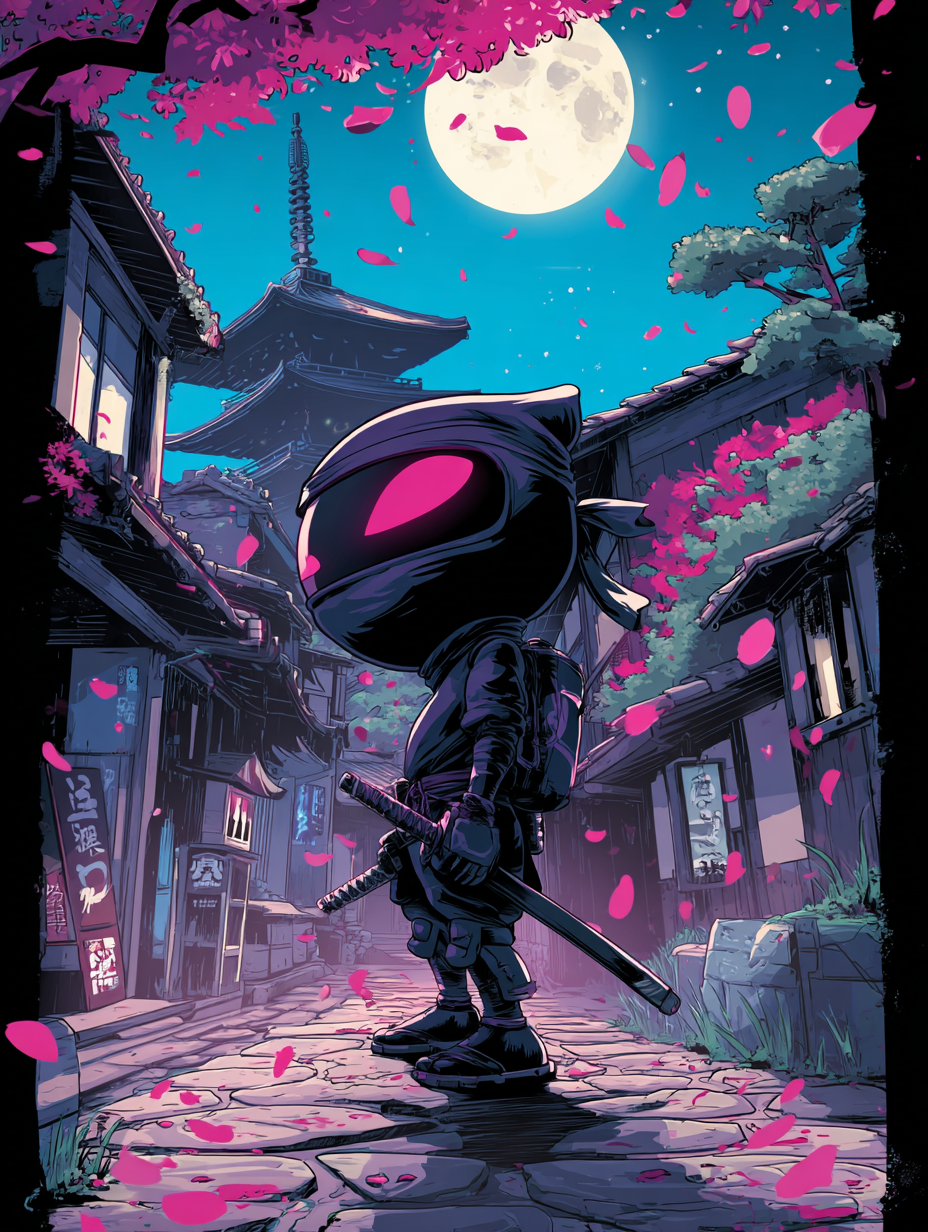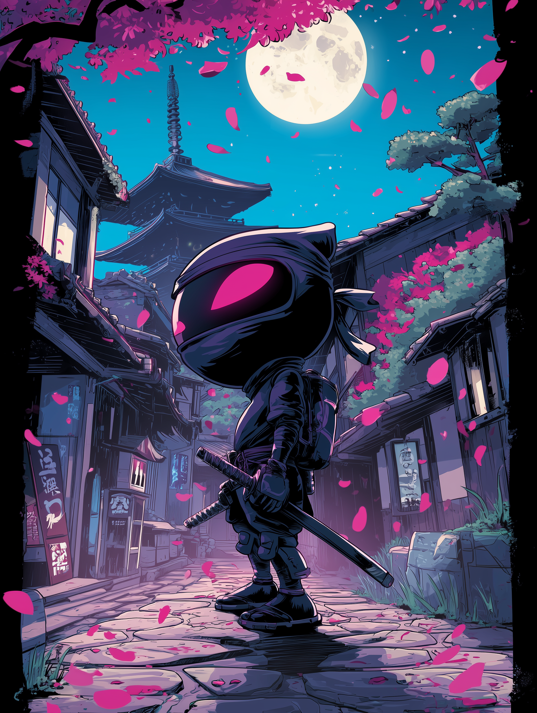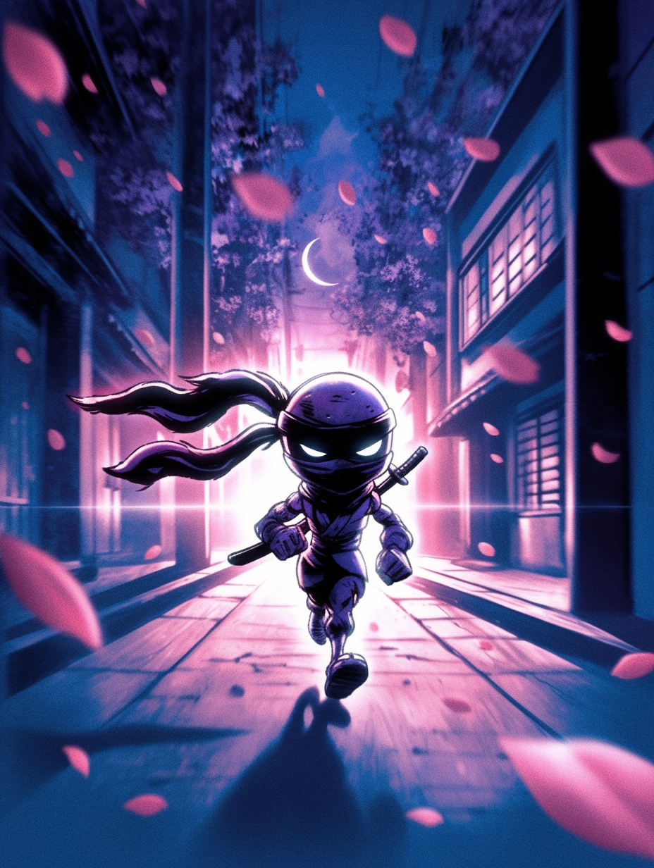 Purple ninja mascot character walking through Kyoto streets, katana gleaming in the bright sunlight, traditional Japanese households line the streets and a temple is visible in the background, cherry blossom petals swirling throughout the air in a zen minimalism, dynamic, mysterious style, viewed from a low angle shot, wide shot, moonlight lighting, at night, with a cinematic, urban vibe, accented by neon glow, lens flare, featuring saturated colors, cyan, pink, purple colors, with reflective effects --v 7 --ar 3:4 --c 20 --weird 100 --s 950 --sref https://dhzkdndgolte1.cloudfront.net/eyJidWNrZXQiOiJtcG0tcHJvZHVjdGlvbi0yMDI1Iiwia2V5IjoicHJvbXB0cy8yeGt5dnBla256dTQ0cjYvaW1hZ2VzLzE3NTkxNTU3NDY5OTEtOS0yOS0yNS1reW90by5wbmciLCJlZGl0cyI6eyJyZXNpemUiOnsid2lkdGgiOjgwMCwiaGVpZ2h0Ijo2MDAsImZpdCI6Imluc2lkZSJ9LCJxdWFsaXR5Ijo4NX19 --sw 600