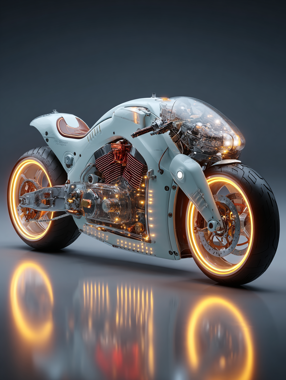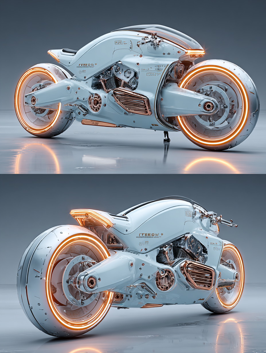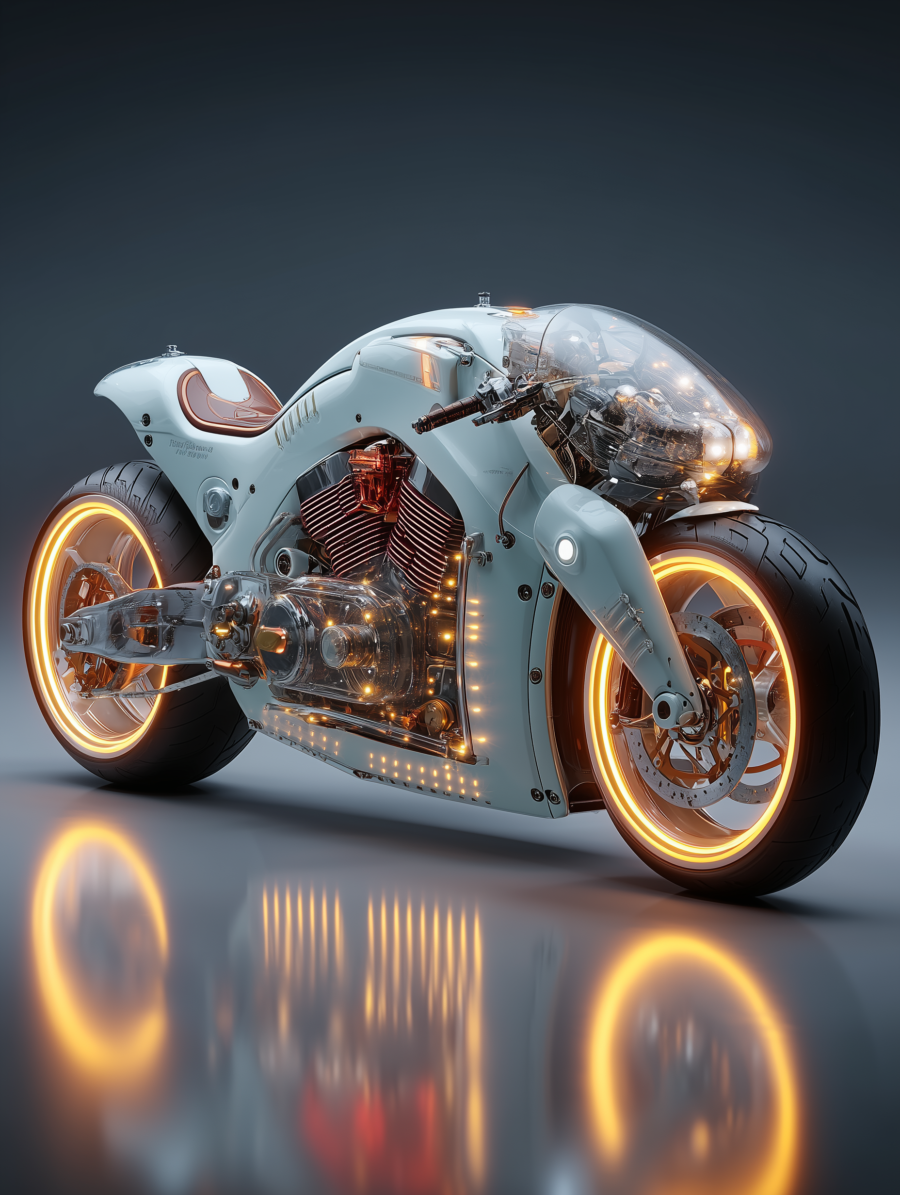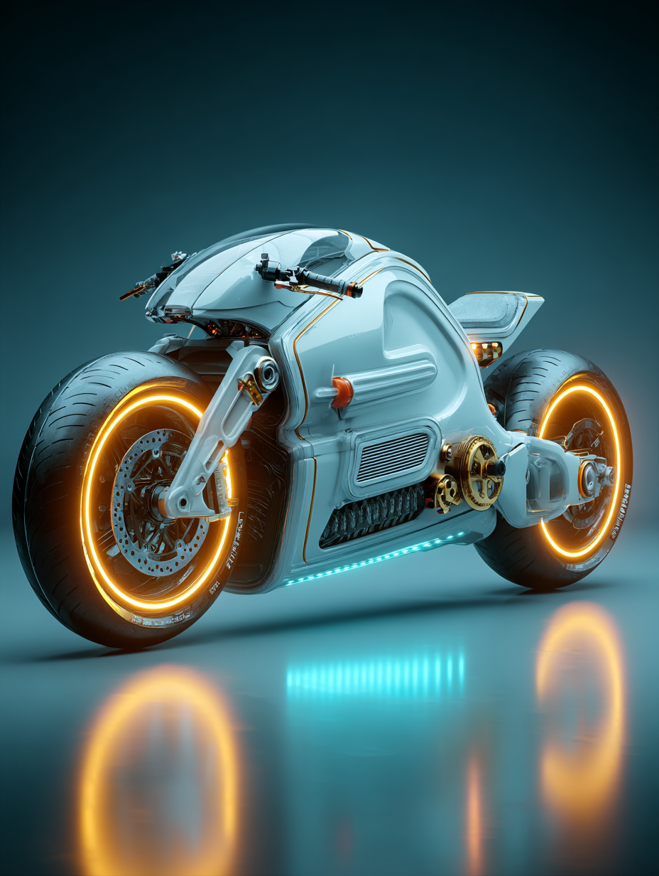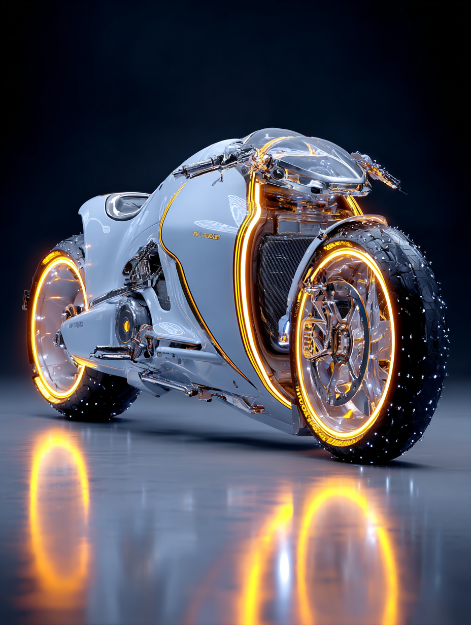 Futuristic concept motorcycle with sleek white aerodynamic bodywork, glowing neon yellow wheel rims and accents, midnight blue underglow lighting, exposed carbon fiber engine components, studio photography on gradient blue background, clean minimalist design with flowing curves and sharp angular details in a sci-fi, dynamic style, viewed from a full shot, shot on fujifilm x-t4 with fujinon xf 16-55mm f/2.8 r lm wr lens, with a modern vibe, accented by neon glow, fluorescence, featuring vibrant contrasts, limited palette, deep blue, orangered, silver colors, with reflective, shiny, electroluminescence effects --v 7 --ar 3:4 --c 30 --weird 100 --s 950 --sref https://dhzkdndgolte1.cloudfront.net/eyJidWNrZXQiOiJtcG0tcHJvZHVjdGlvbi0yMDI1Iiwia2V5IjoicHJvbXB0cy83enA0dnV4Z3ZsN2NleXgvaW1hZ2VzLzE3NTg4MDM4OTY0NzgtOS0yNS0yNS1tb3RvLnBuZyIsImVkaXRzIjp7InJlc2l6ZSI6eyJ3aWR0aCI6ODAwLCJoZWlnaHQiOjYwMCwiZml0IjoiaW5zaWRlIn0sInF1YWxpdHkiOjg1fX0= --sw 600