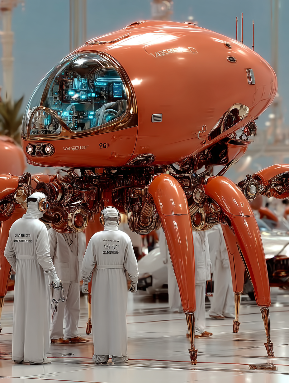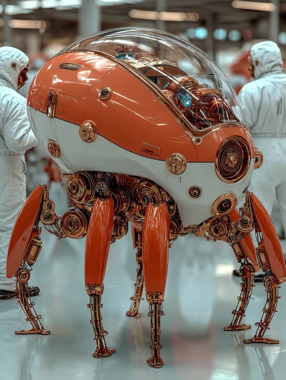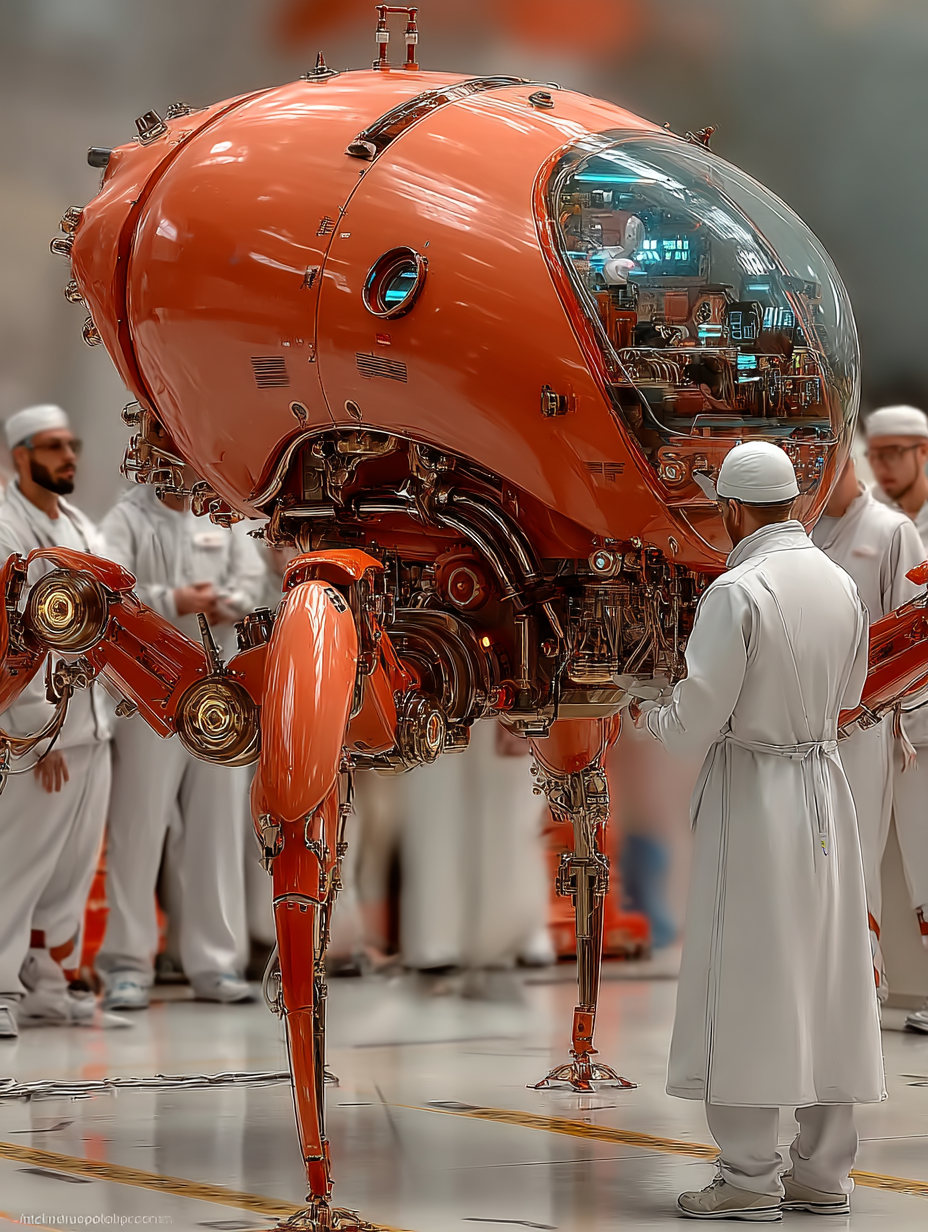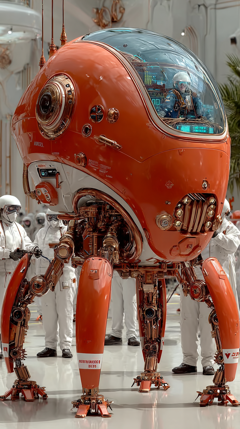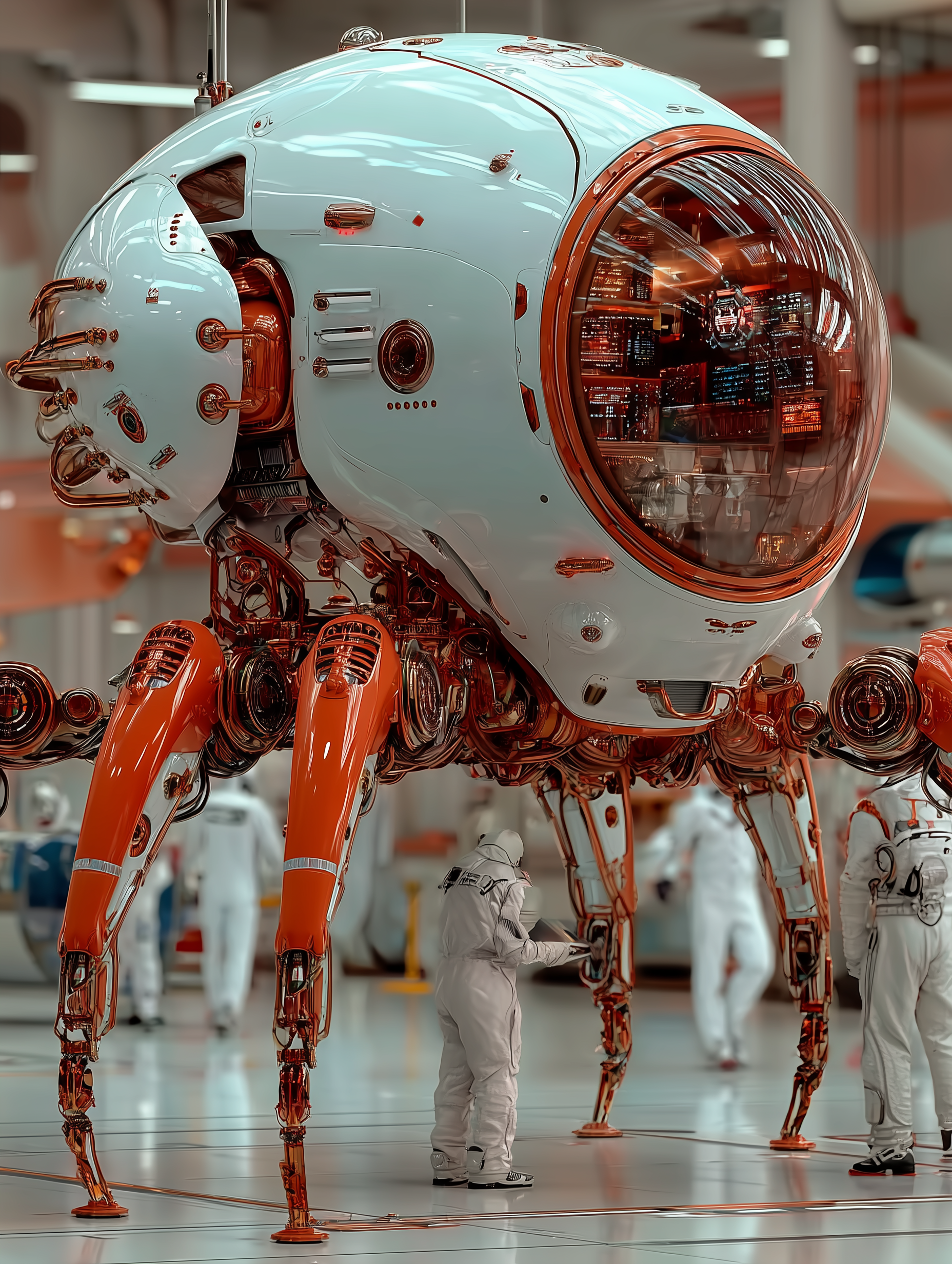Advanced robotic spider-like mechanical walker with sleek orange and red armor plating, articulated legs with hydraulic joints, transparent cockpit dome revealing high-tech interior displays, positioned in a pristine white laboratory hangar with technicians in white suits conducting maintenance, featuring complex mechanical details and glossy metallic surfaces in a cyberpunk, dramatic, mysterious style, viewed from a low angle shot, wide shot, shot on sony fx6 with sony fe c 16-35mm t3.1 g lens, diffused sunlight, laboratory lighting lighting, at afternoon, with a advanced technology, cinematic, futuristic vibe, accented by atmospheric light, overhead, spacecraft glow, bright highlights, dramatic highlights, subtle glow, featuring high-contrast colors, vibrant colors, orange, red, white colors, with glossy reflection, polished, specular highlights, photoluminescence effects --v 7 --ar 3:4 --c 15 --s 850 --style raw --sref https://dhzkdndgolte1.cloudfront.net/eyJidWNrZXQiOiJtcG0tcHJvZHVjdGlvbi0yMDI1Iiwia2V5IjoicHJvbXB0cy9obmwyYXRsbTgwZ2U3YjAvaW1hZ2VzLzE3NTg0ODMzODgyNDktOS0yMS0yNS1idWJibGUtd2Fsa2VyLnBuZyIsImVkaXRzIjp7InJlc2l6ZSI6eyJ3aWR0aCI6ODAwLCJoZWlnaHQiOjYwMCwiZml0IjoiaW5zaWRlIn0sInF1YWxpdHkiOjg1fX0= --sw 800