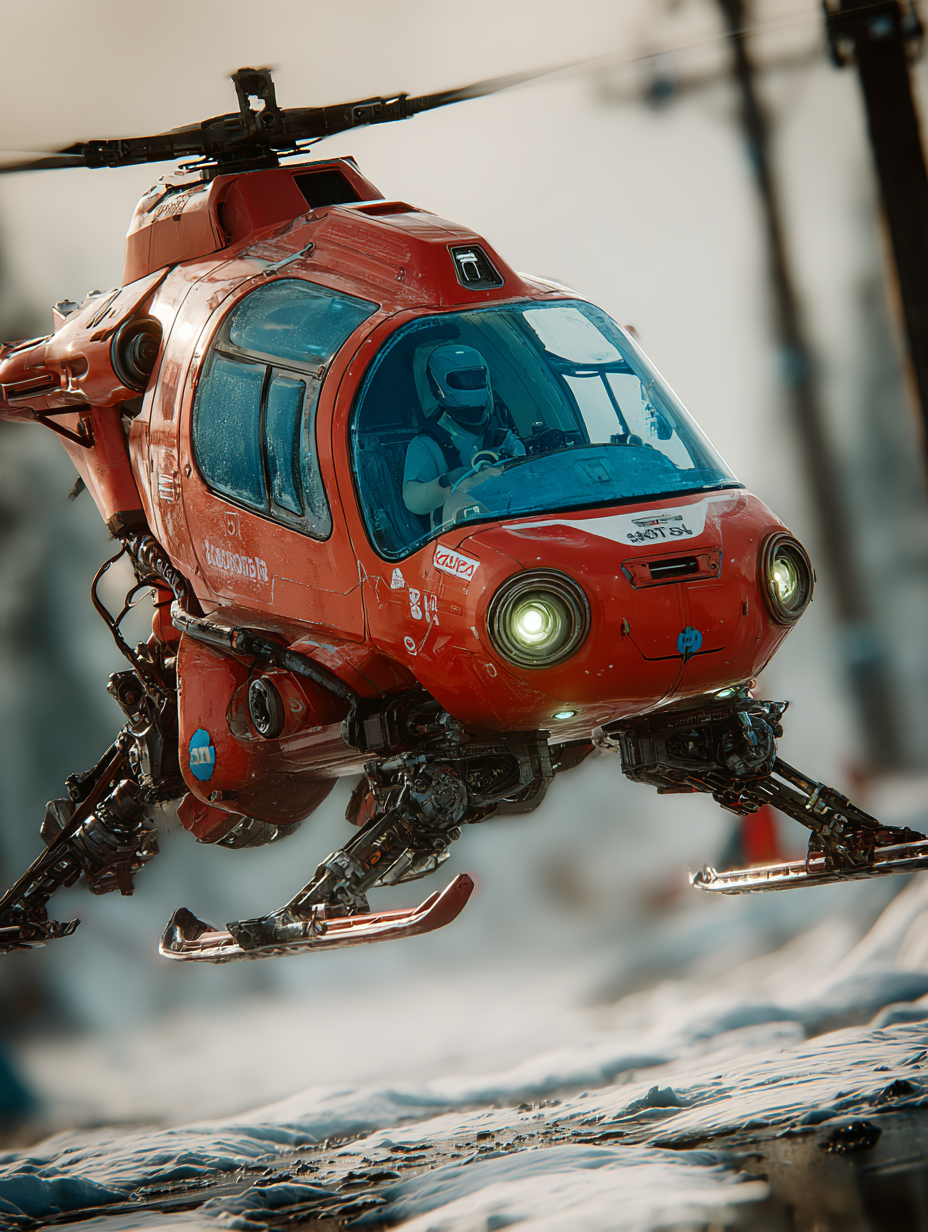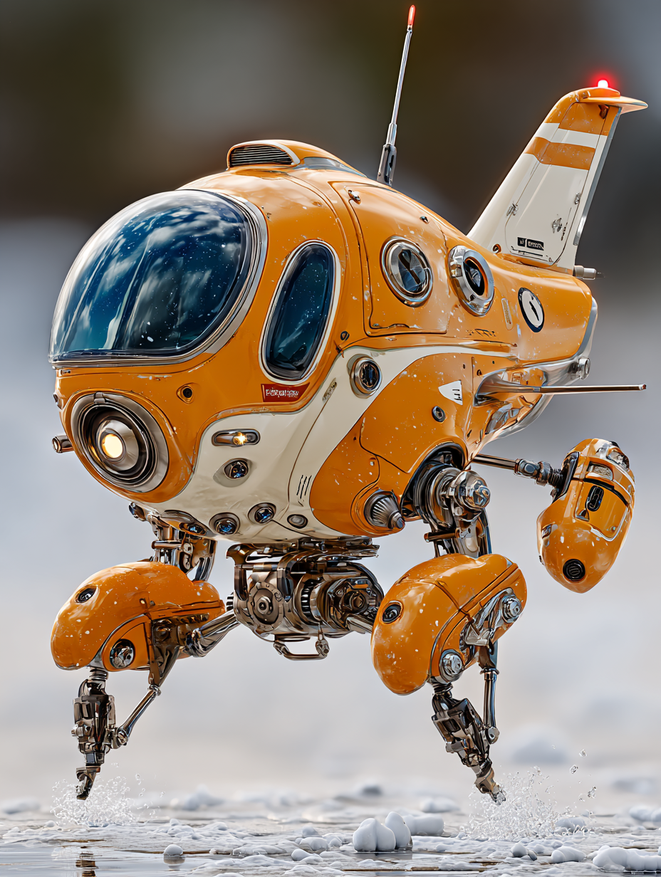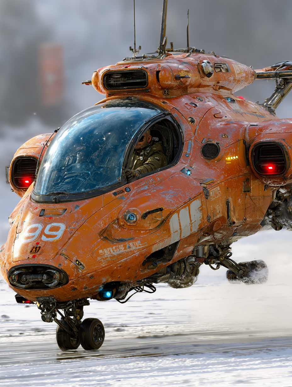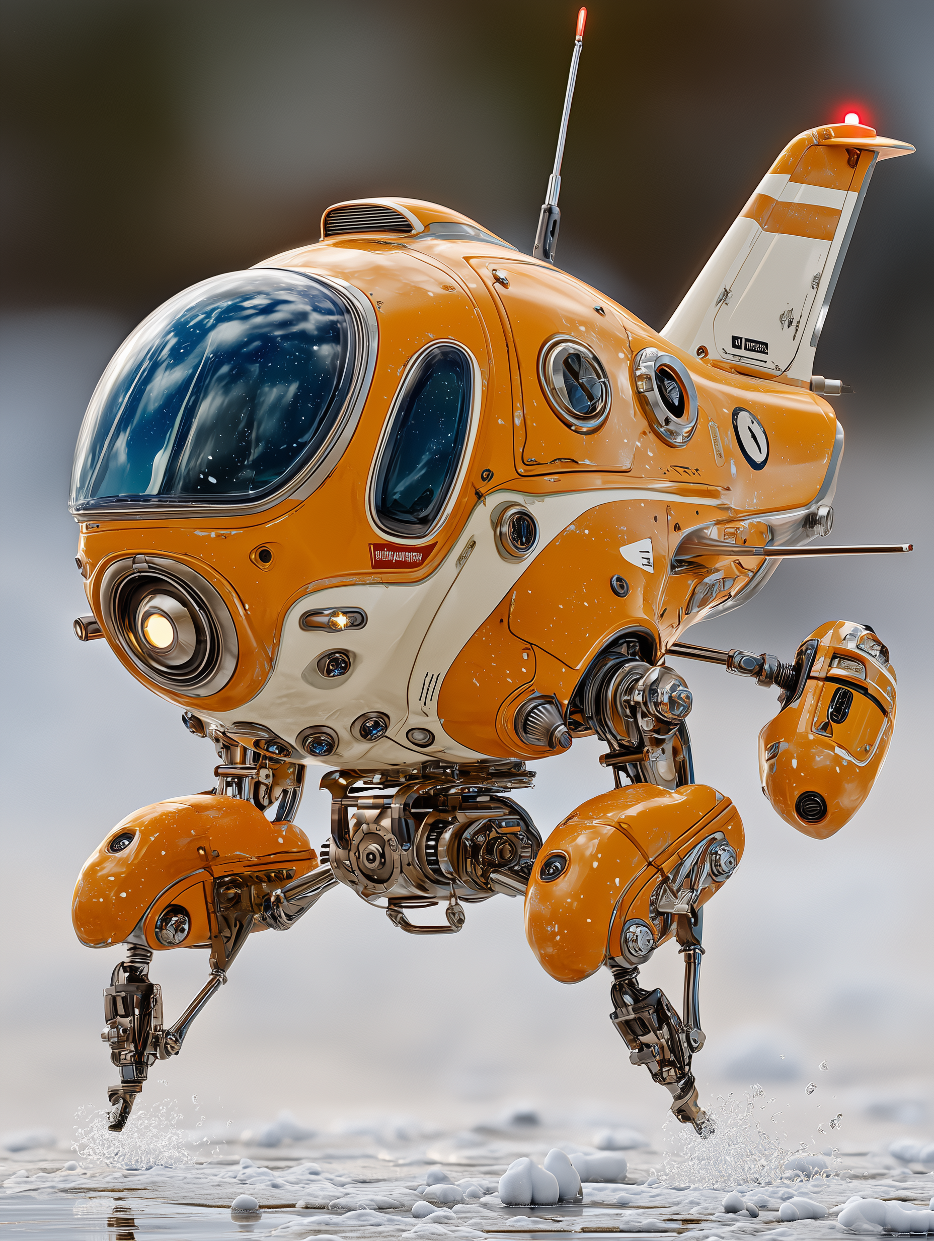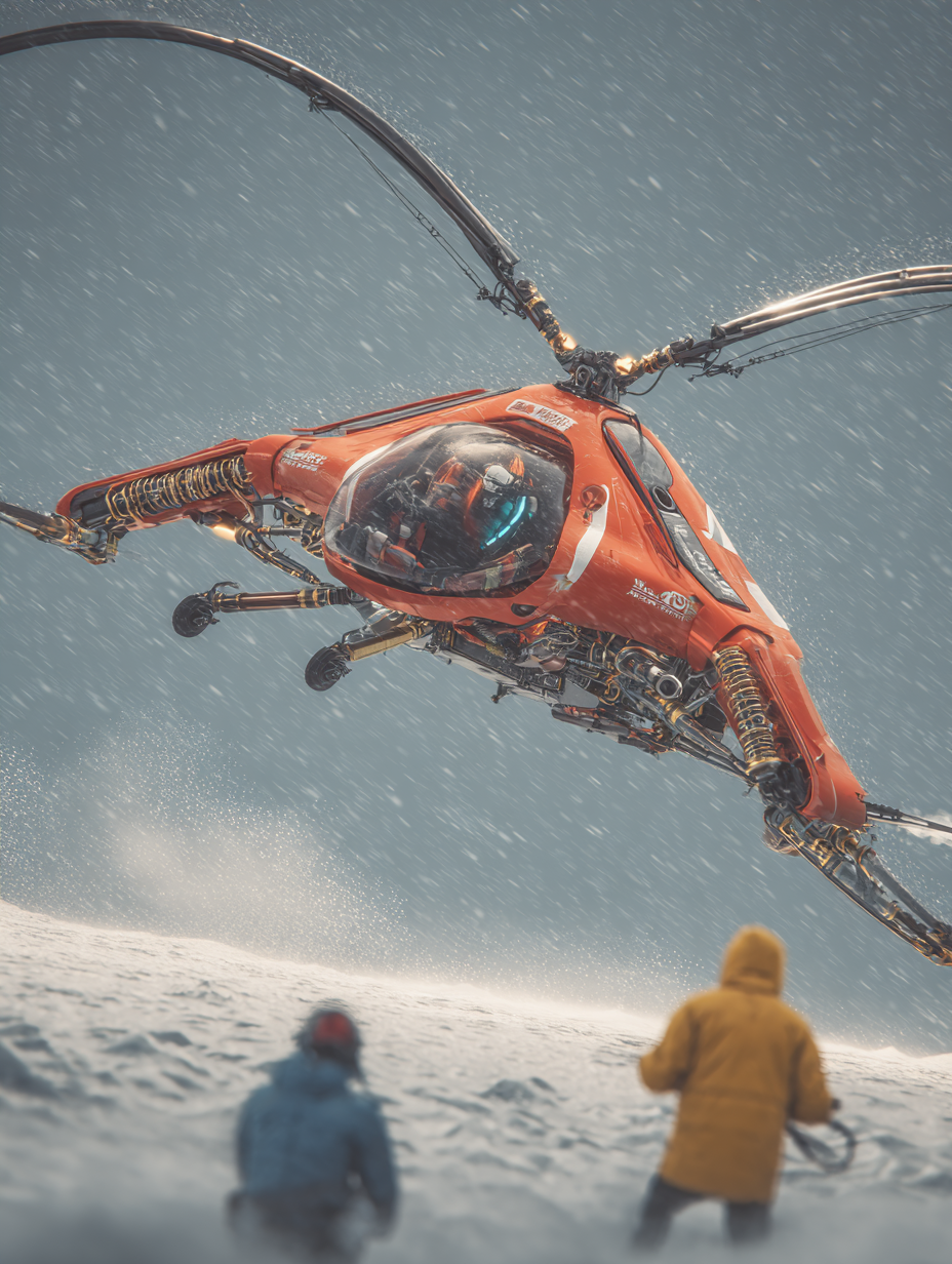 Personal flying vehicle with sleek aerodynamic design, single pilot cockpit, compact futuristic aircraft, hovering above snowy terrain, orange and white livery with detailed mechanical components in a sci-fi, playful style, viewed from a low angle shot, medium shot, shot on kodak portra 800 film, overcast lighting, at afternoon, with a cinematic vibe, accented by atmospheric light, featuring cool tones, blue, orange, white colors --v 7 --ar 3:4 --c 20 --s 850 --sref https://dhzkdndgolte1.cloudfront.net/eyJidWNrZXQiOiJtcG0tcHJvZHVjdGlvbi0yMDI1Iiwia2V5IjoicHJvbXB0cy9qaDdscDF3OXZkNmxtam8vaW1hZ2VzLzE3NTgzMDY4MTUwMzMtOS0xOS0yNS1wb2QucG5nIiwiZWRpdHMiOnsicmVzaXplIjp7IndpZHRoIjo4MDAsImhlaWdodCI6NjAwLCJmaXQiOiJpbnNpZGUifSwicXVhbGl0eSI6ODV9fQ== --sw 400