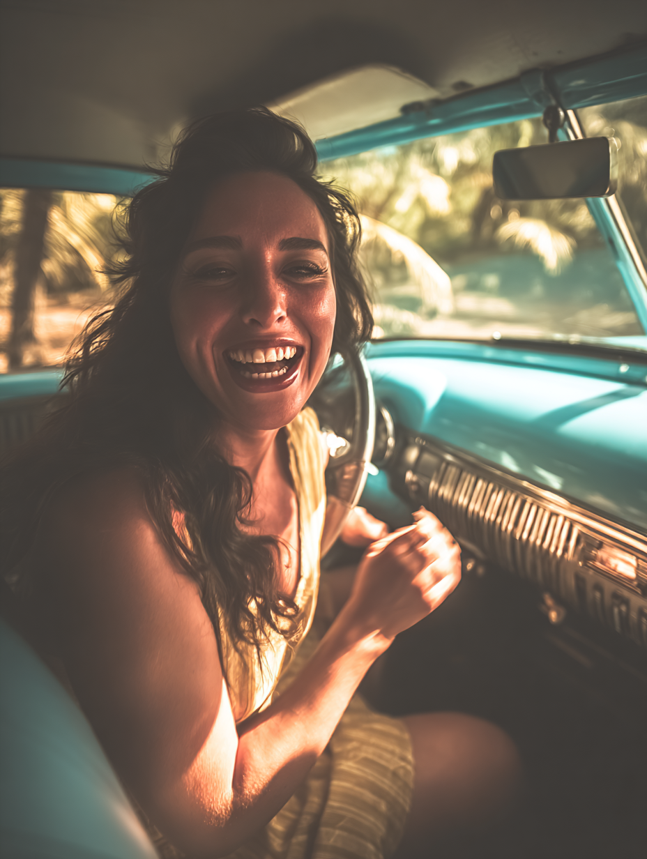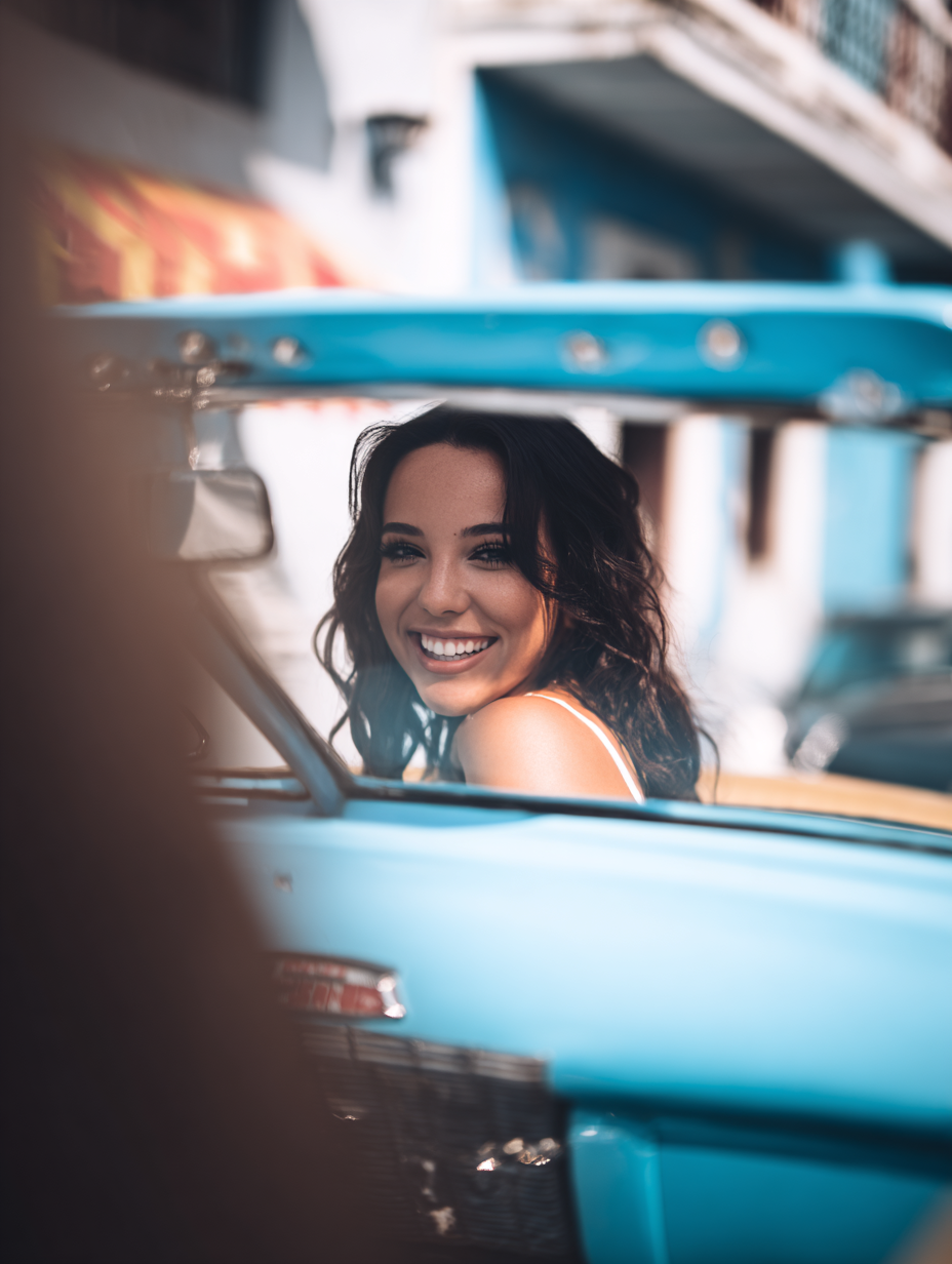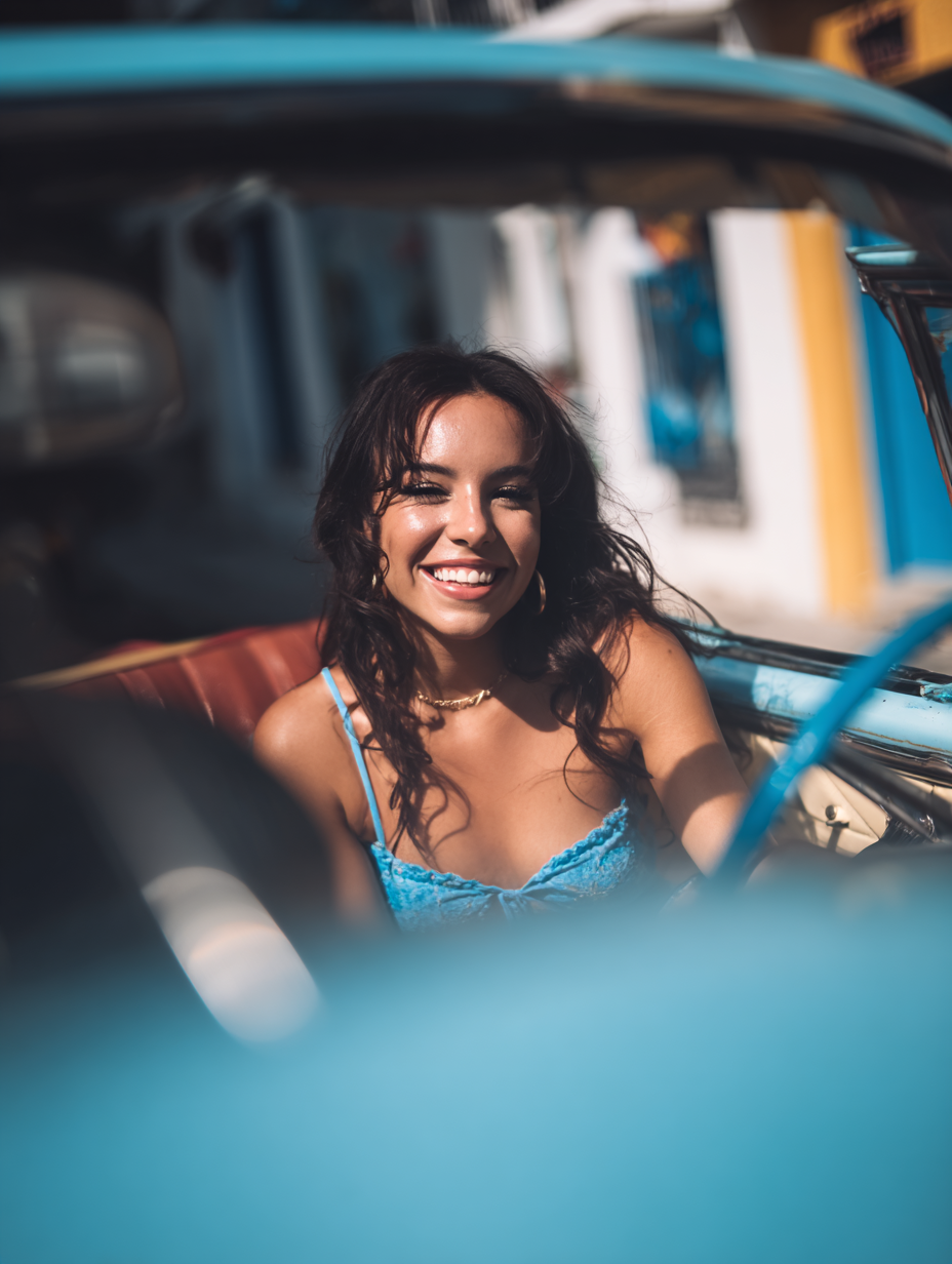A beautiful Spanish female model with a wide, radiant smile sitting inside a vintage 1950s Chevrolet in Cuba, colorful bright graffiti art covering Spanish colonial architecture buildings in the background, warm tropical atmosphere, vibrant street photography aesthetic, classic car interior details visible, natural candid moment captured in a vintage, content, energetic, joyful, vibrant style, viewed from a candid shot, eye level shot, medium shot, soft morning light, sunny lighting, at morning, with a bright and vibrant, classic, vintage vibe, accented by natural light, soft shadows, subtle highlights, featuring saturated colors, vibrant colors, warm tones, aqua, coral, orange, pink, turquoise, yellow, tropical punch, vintage, warm colors, with weathered stone, polished reflection, shimmer effects --v 7 --ar 3:4 --c 100 --s 800 --style raw --sref https://dhzkdndgolte1.cloudfront.net/eyJidWNrZXQiOiJtcG0tcHJvZHVjdGlvbi0yMDI1Iiwia2V5IjoicHJvbXB0cy9uaW9jb282d3RrNmdwNDEvaW1hZ2VzLzE3NjI2MTM1NjczMjQtMTEtOC0yNS1jdWJhbi1zbWlsaW5nLnBuZyIsImVkaXRzIjp7InJlc2l6ZSI6eyJ3aWR0aCI6ODAwLCJoZWlnaHQiOjYwMCwiZml0IjoiaW5zaWRlIn0sInF1YWxpdHkiOjg1fX0= --sw 400 --w 0 gogravital
