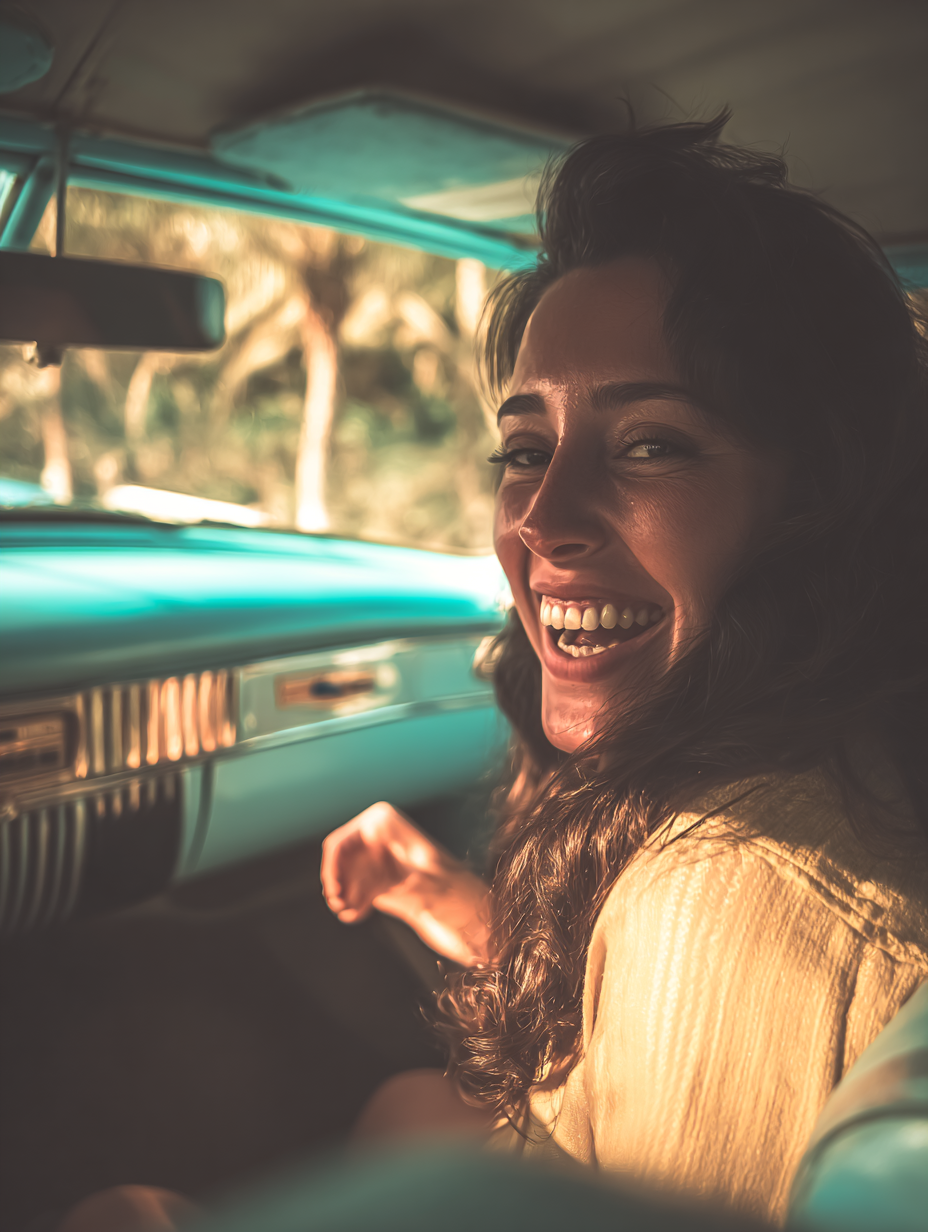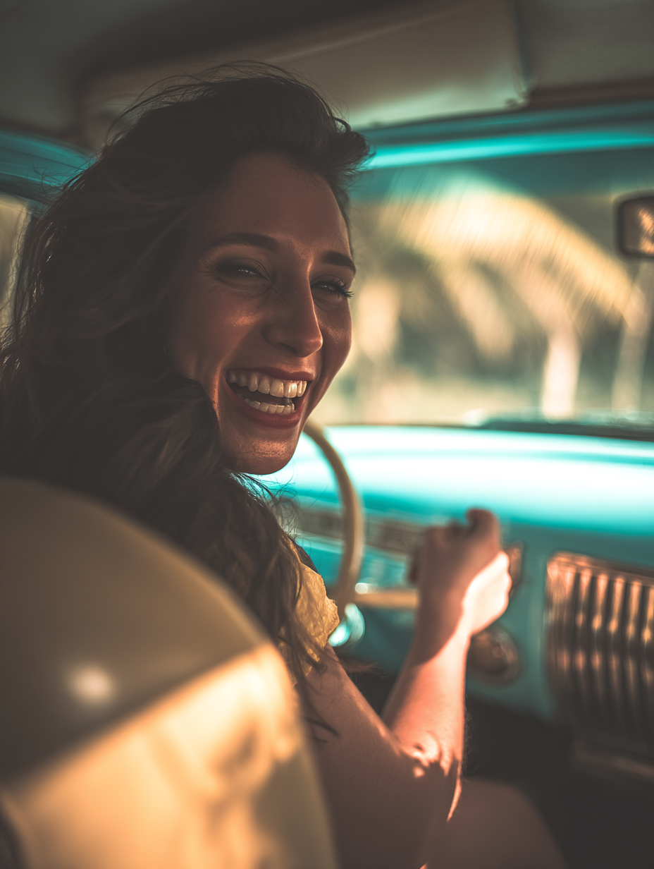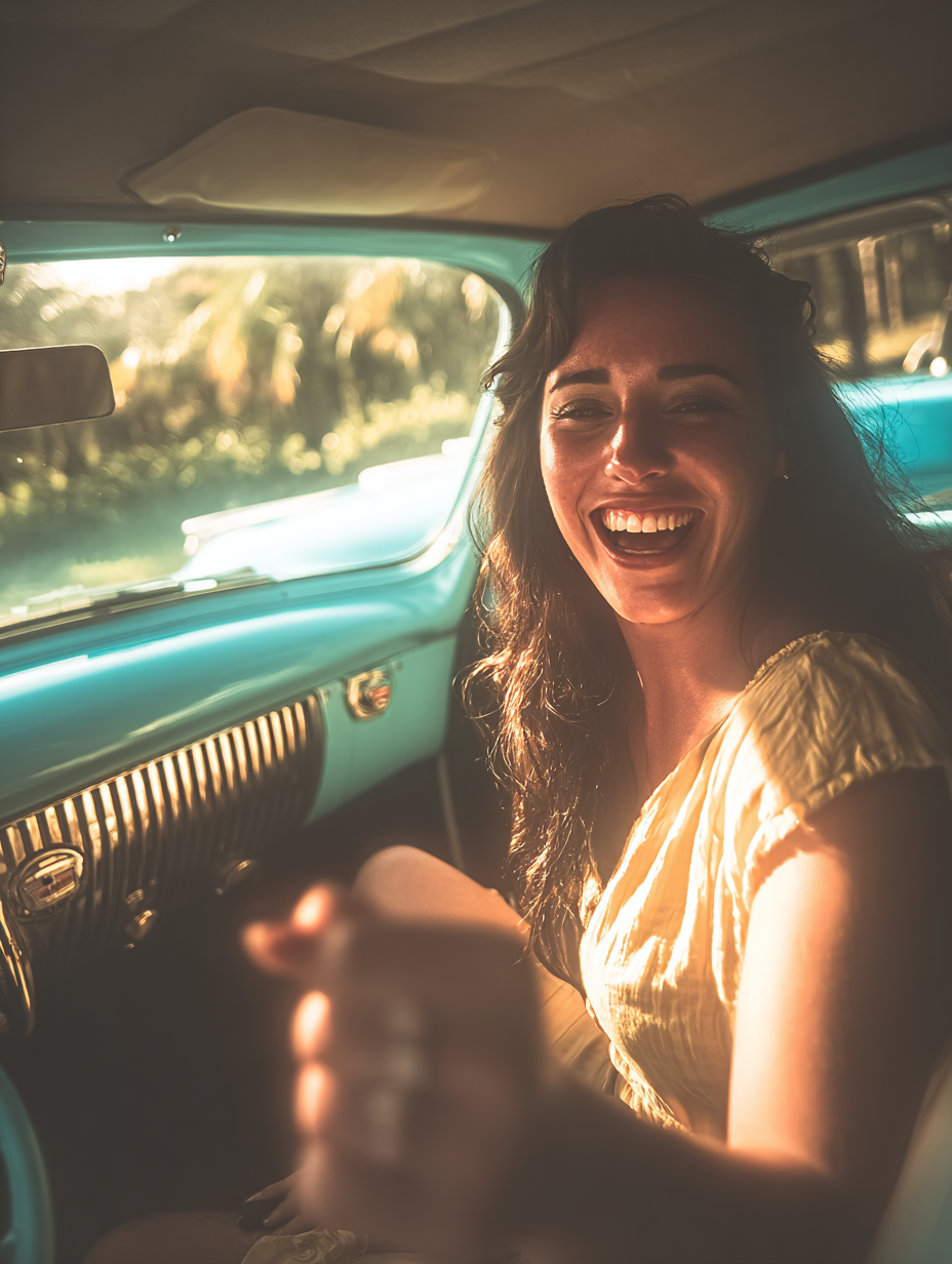A beautiful Spanish female model with a wide, radiant smile sitting inside a vintage 1950s Chevrolet in Cuba, colorful bright graffiti art covering Spanish colonial architecture buildings in the background, warm tropical atmosphere, vibrant street photography aesthetic, classic car interior details visible, natural candid moment captured in a vintage, content, energetic, joyful, vibrant style, viewed from a candid shot, eye level shot, medium shot, soft morning light, sunny lighting, at morning, with a bright and vibrant, classic, vintage vibe, accented by natural light, soft shadows, subtle highlights, featuring saturated colors, vibrant colors, warm tones, aqua, coral, orange, pink, turquoise, yellow, tropical punch, vintage, warm colors, with weathered stone, polished reflection, shimmer effects --v 7 --ar 3:4 --c 100 --s 800 --style raw --sref https://dhzkdndgolte1.cloudfront.net/eyJidWNrZXQiOiJtcG0tcHJvZHVjdGlvbi0yMDI1Iiwia2V5IjoicHJvbXB0cy9uaW9jb282d3RrNmdwNDEvaW1hZ2VzLzE3NjI2MTM1NjczMjQtMTEtOC0yNS1jdWJhbi1zbWlsaW5nLnBuZyIsImVkaXRzIjp7InJlc2l6ZSI6eyJ3aWR0aCI6ODAwLCJoZWlnaHQiOjYwMCwiZml0IjoiaW5zaWRlIn0sInF1YWxpdHkiOjg1fX0= --sw 400 --w 0 gogravital