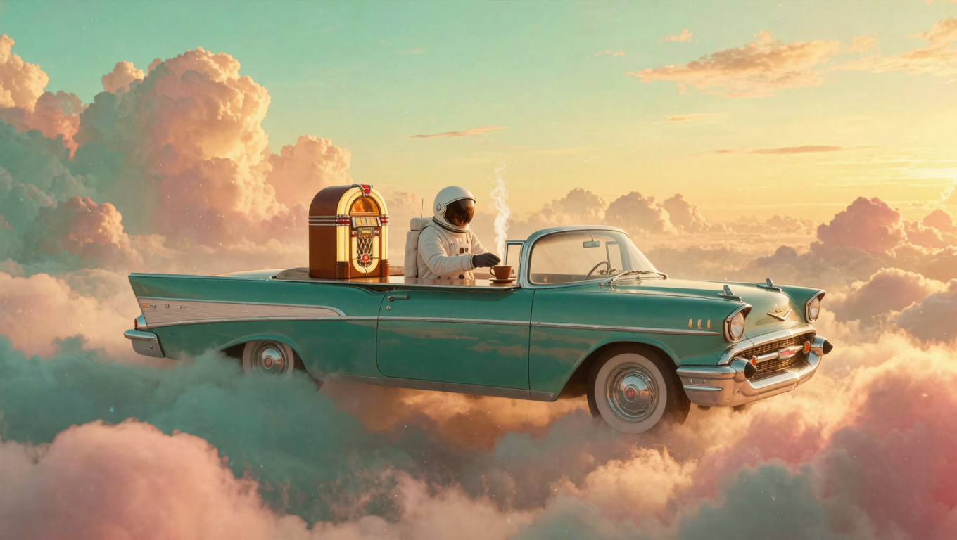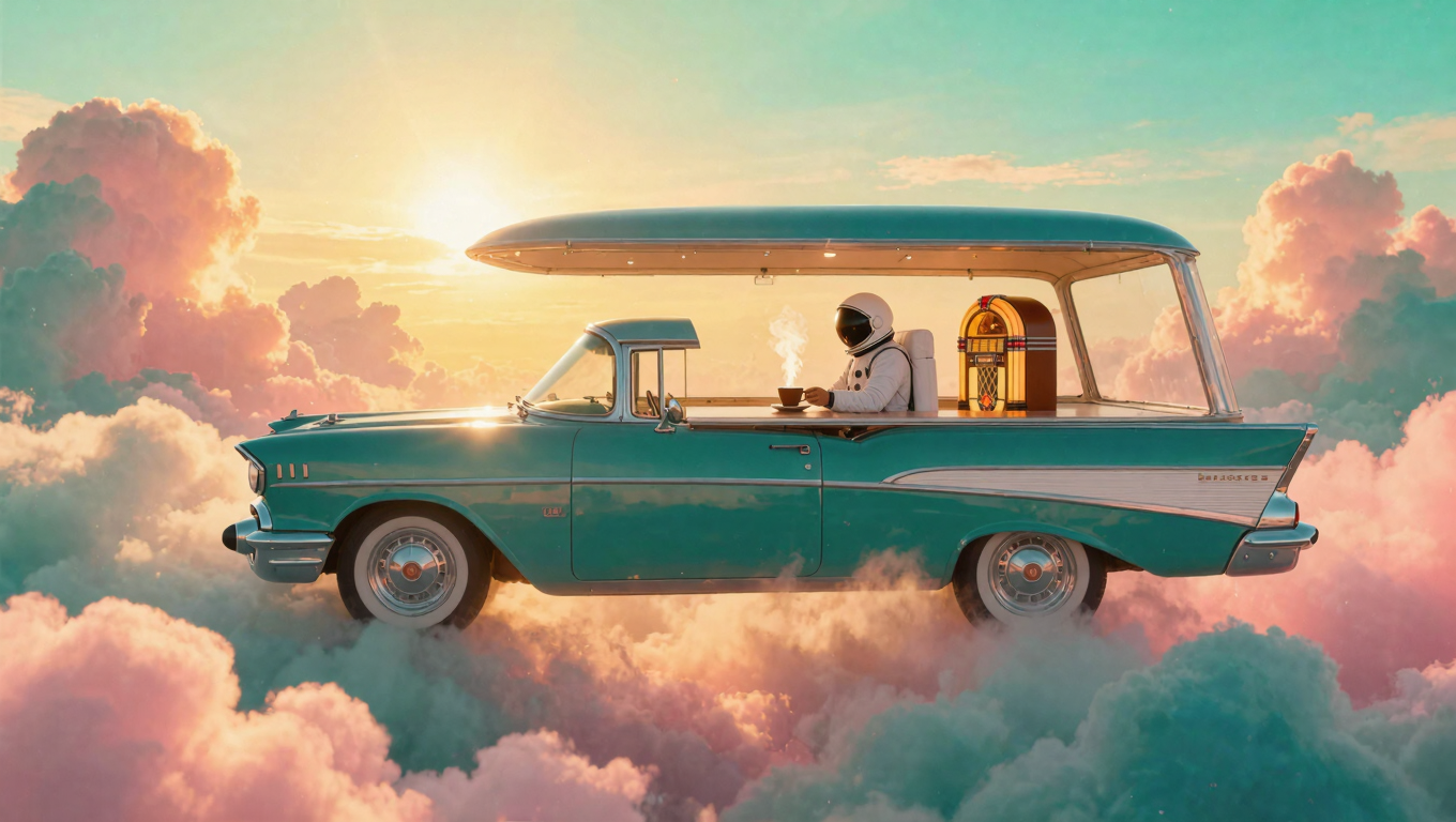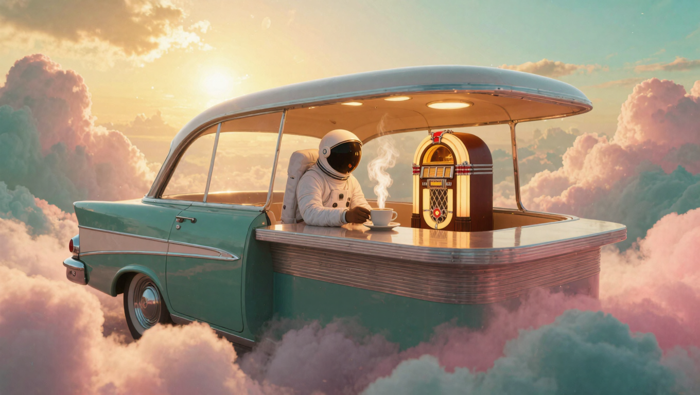 A retro 1950s diner-car floating in a surreal cloudscape at golden hour, pastel pink and turquoise clouds slowly drifting and evolving around the scene. An astronaut in a white spacesuit sits at the chrome counter, carefully setting down a steaming coffee cup as wisps of steam curl upward. The vintage jukebox glows with warm amber light that pulses gently like a heartbeat, casting soft reflections on the chrome surfaces. Golden sunlight filters through the ethereal clouds, creating a dreamlike, mysterious atmosphere of solitude and wonder. --v 7 --ar 16:9 --c 0 --w 0 --s 100 --q 1 keypromptninja