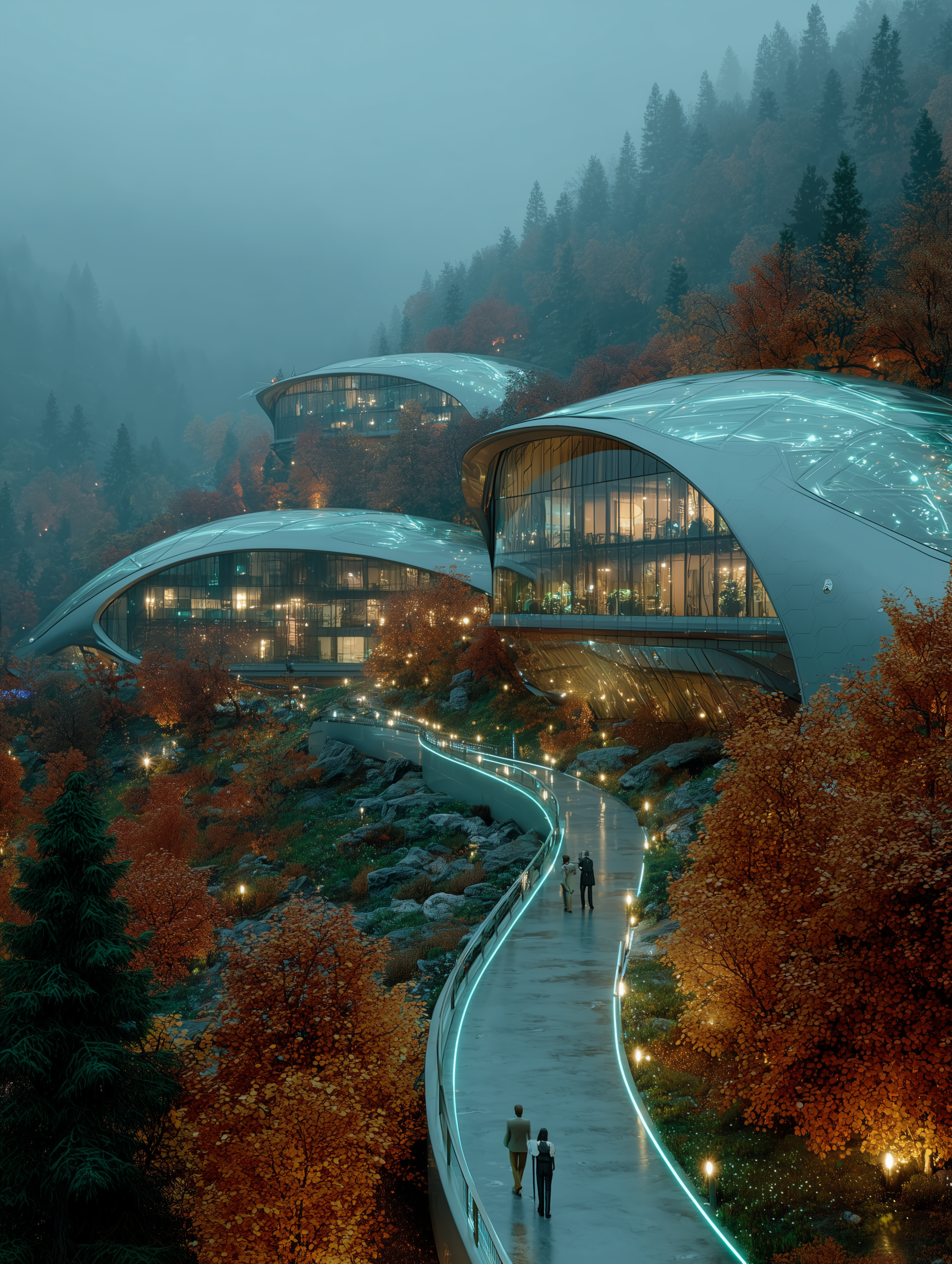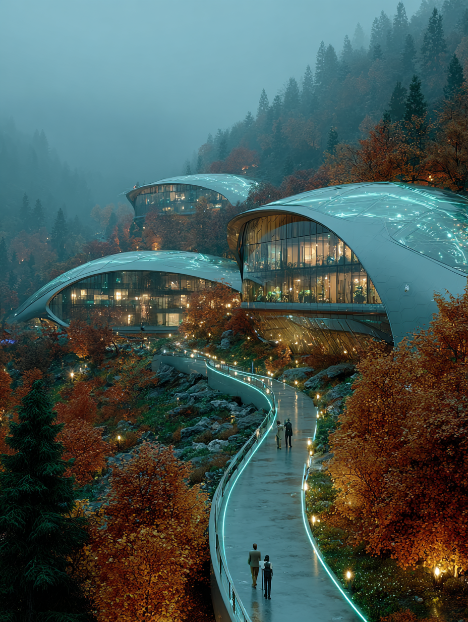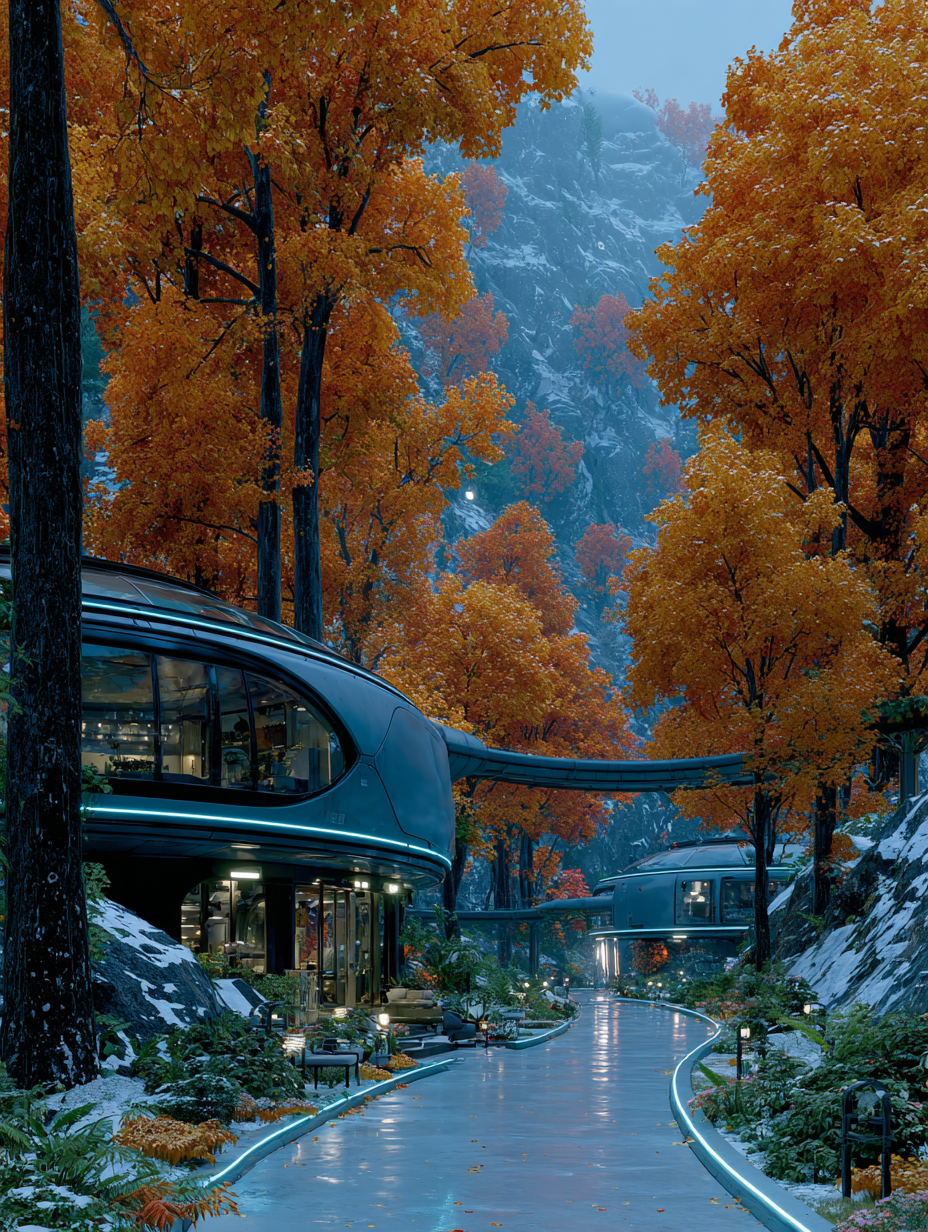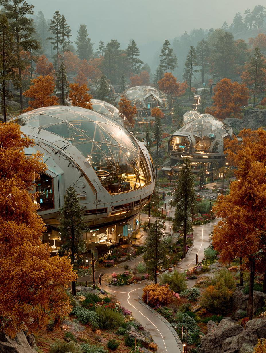 A futuristic high-tech habitat seamlessly integrated into an autumn forest with sleek metallic architecture, glowing holographic displays, and advanced technology merged with nature, surrounded by vibrant fall foliage in brilliant oranges, golds, and deep reds, featuring transparent bio-dome sections and neon-lit pathways weaving through the colorful woodland in a sci-fi, awe inspiring, mysterious style, viewed from a drone shot, establishing shot, wide shot, diffused sunlight, foggy lighting, at golden hour, with a advanced technology, cinematic, futuristic, sci-fi vibe, accented by atmospheric light, holographic glow, neon glow, spacecraft glow, cinematic light, god rays, lens flare, neon light, featuring cool tones, high-contrast colors, saturated colors, vibrant colors, cyan, gold, orange, silver, cool, deep space, neon colors, with metallic, transparent, glare, glossy, polished, reflection, bioluminescence, electroluminescence, glowing neon, photoluminescence effects --v 7 --ar 3:4 --c 15 --s 750 --sref https://dhzkdndgolte1.cloudfront.net/eyJidWNrZXQiOiJtcG0tcHJvZHVjdGlvbi0yMDI1Iiwia2V5IjoicHJvbXB0cy90Nmpkcnp1dzJhaGJzb20vaW1hZ2VzLzE3NjAzMDEyNzE5NjEtMTAtMTItMjUtcG9kLnBuZyIsImVkaXRzIjp7InJlc2l6ZSI6eyJ3aWR0aCI6ODAwLCJoZWlnaHQiOjYwMCwiZml0IjoiaW5zaWRlIn0sInF1YWxpdHkiOjg1fX0= --sw 400 sparker888